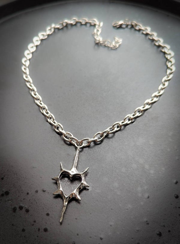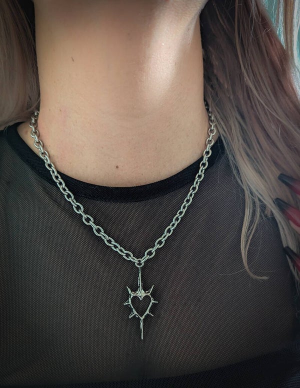 Edgy thorned/ spiked heart pendant chain necklace in silver!