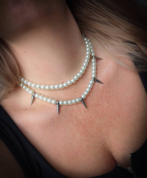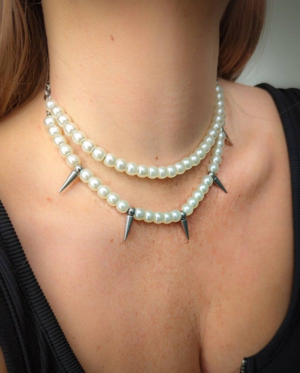 Double layered necklace with faux pearls and stainless steel spike rivets.