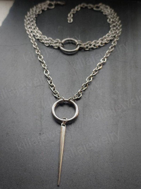 Stunning multilayer chain necklace with large O rings and long silver spike pendant!
